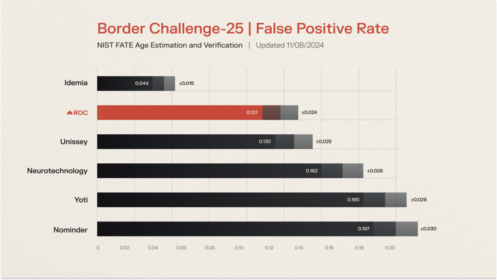 Denver, CO – ROC, the leading American-made multimodal biometrics provider, today announced its top-tier ranking in the recent NIST Face Analysis Technology Evaluation (FATE) for Age Estimation and Verification. The report underscores the significant advancements in age estimation technologies, highlighting their real-world potential as cutting-edge, privacy-conscious solutions for managing access to age-restricted products, services, and content.