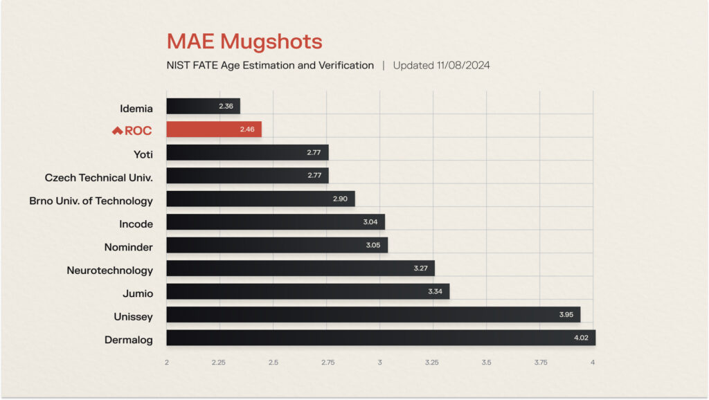 In the most recent NIST FATE benchmark, ROC was the top U.S. provider of age verification technology, and second globally, with an average Mean Absolute Error (MAE) of 2.96 years across three main datasets – application, border, and mugshot.